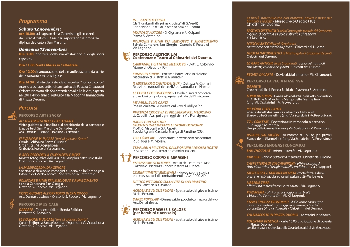 lo stand sarà allestito lungo i chiostrini del Duomo e sarà attivo dalle 9 alle 18. Saranno presenti numerosi prodotti gastronomici delle vallate e delle campagne piacentine, oltre ai vini Doc e ai Salumi Dop. Durante la giornata iniziative per tutti i gusti... percorsi dedicati a ragazzi, culturali, storici, enogastronomici, musicali, di arte sacra...