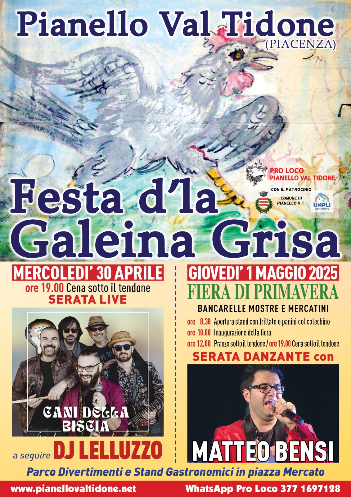 Mercoledì 30 Aprile, apre ufficialmente la stagione delle manifestazioni pianellesi organizzate dalla Pro Loco con la Festa d'la Galeina Grisa e la Fiera di Primavera. Stand gastronomici, spettacoli, parco divertimenti per grandi e piccini, bancarelle e mercatini, mostre e hobbystica, enogastronomia... Vi aspettiamo a Pianello! - Infoline&WhatsApp: 3771697128