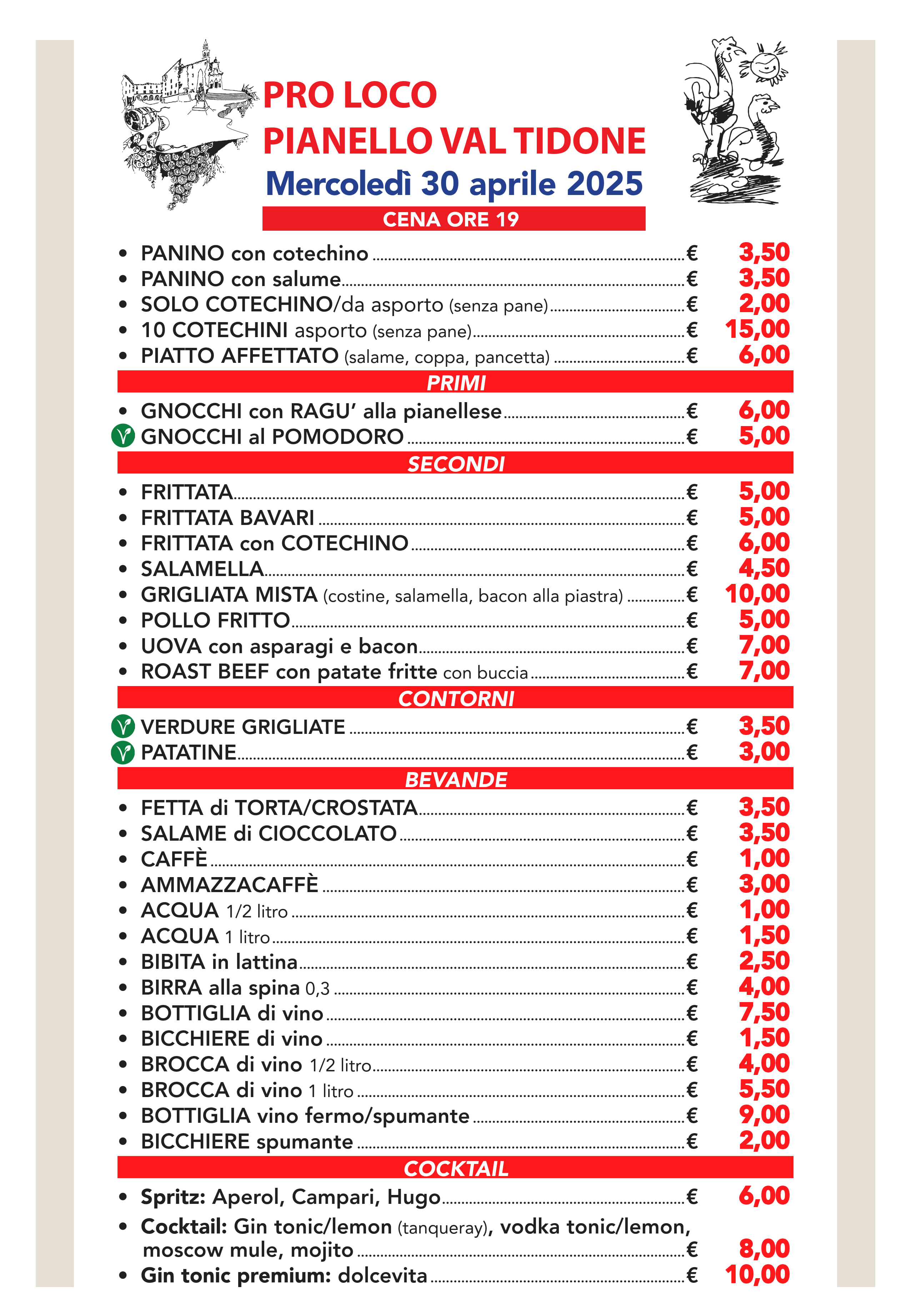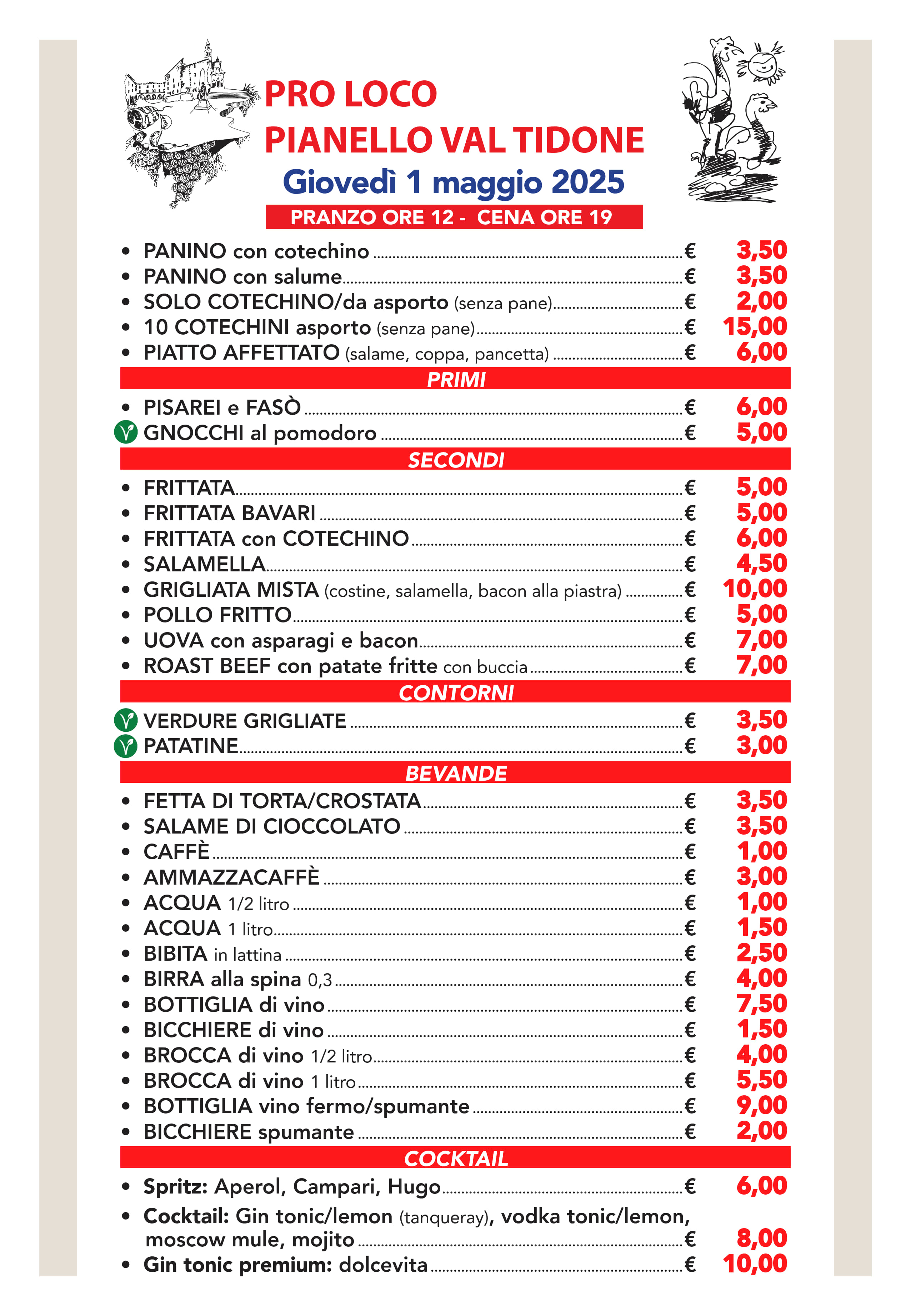 1 Maggio - stand aperti dalle ore 8.30 per tutta la giornata (pranzo ore 12, cena dalle ore 19)