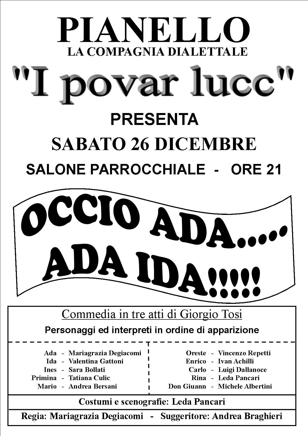 Come da tradizione ormai ultraventennale la compagnia teatrale dialettale di Pianello "I Povar Lucc" presenta la commedia in dialetto piacentino di Giorgio Tosi "Ocio Ada, ...Ada Ida"