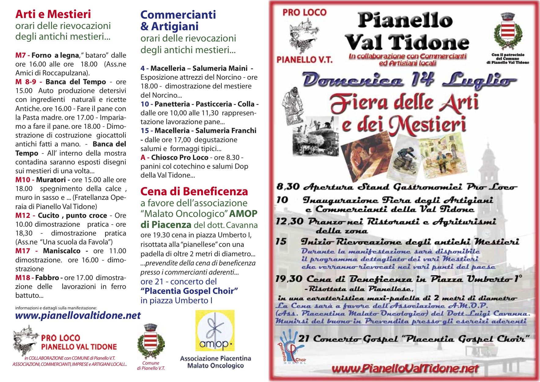 A Pianello Val Tidone domenica 14 Luglio la Pro Loco di Pianello Val Tidone in collaborazione con associazioni, commercianti, artigiani, esercenti, imprese locali e Comune di Pianello Val Tidone organizzano la prima "Fiera delle Arti e dei Mestieri" con la partecipazione esclusiva delle professioni e delle attività economiche locali, commercianti, artigiani, esercenti, ristoratori, ecc... La manifestazione prevede la rievocazione di alcuni mestieri storici e delle arti che animano l'economia locale dell'Alta Val Tidone, la serata di domenica 14 Luglio sarà animata dal coro Gospel "Placentia Gospel Choir" che si esibirà in piazza Umberto I alle 21. Alle ore 19.30 è prevista la "Cena di Beneficenza" in favore dell'Associazione Piacentina Malato Oncologico A.M.O.P. fondata dal dott. Luigi Cavanna. Le prevendite della cena di beneficenza sono disponibili presso gli esercenti e i commercianti pianellesi che hanno aderito.