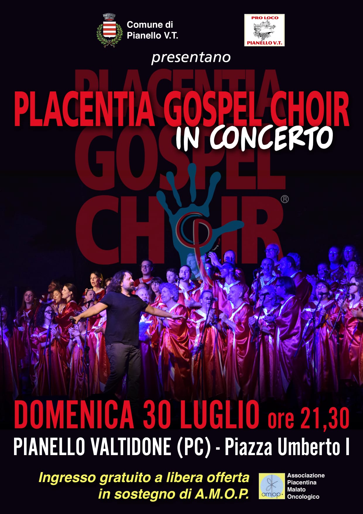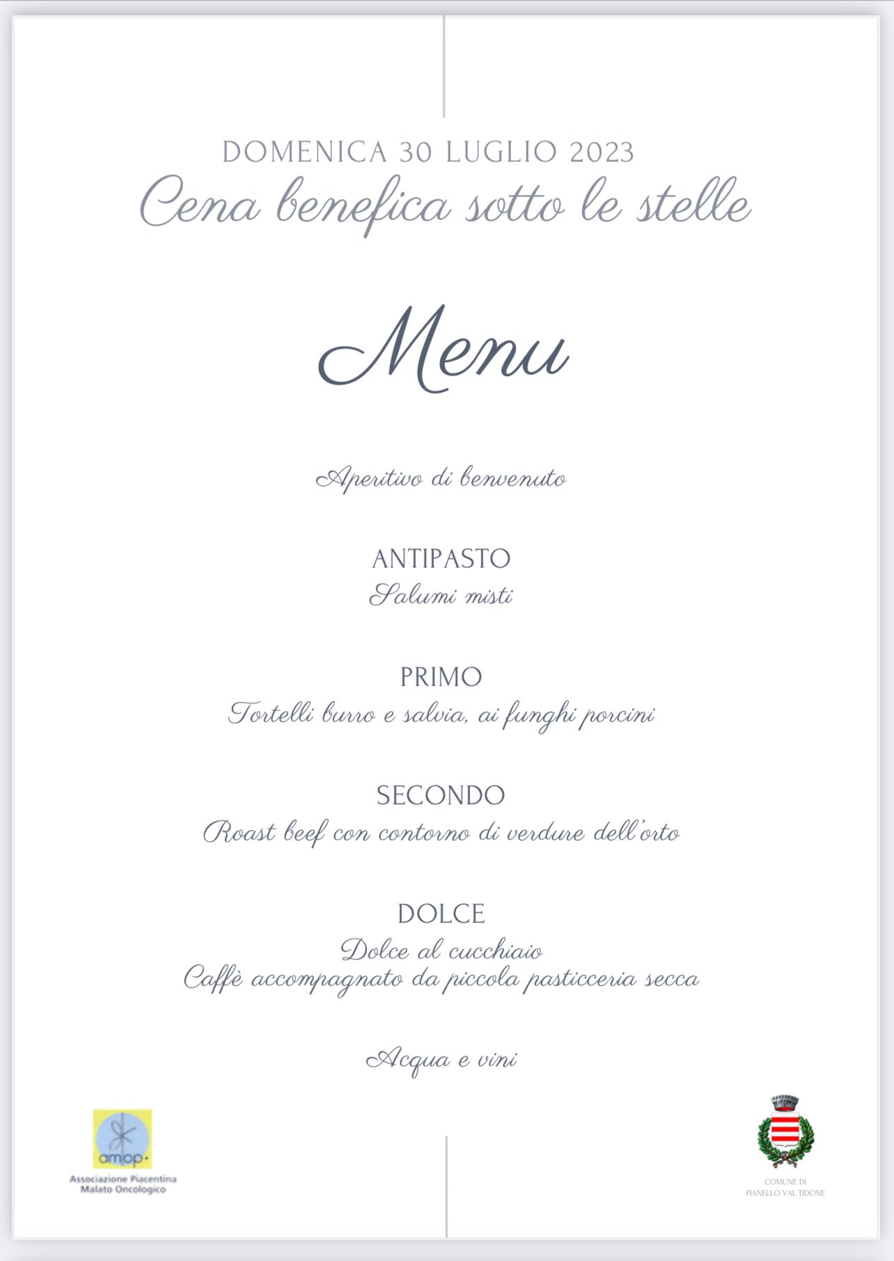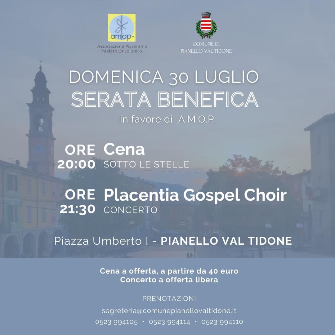 A favore di AMOP associazione piacentina malato oncologico il Comune di Pianello in collaborazione con le associazioni e con alcune attività locali organizza la Cena Benefica Domenica 30 in piazza Umberto I, seguirà lo spettacolo del Placentia Gosplel Choir...