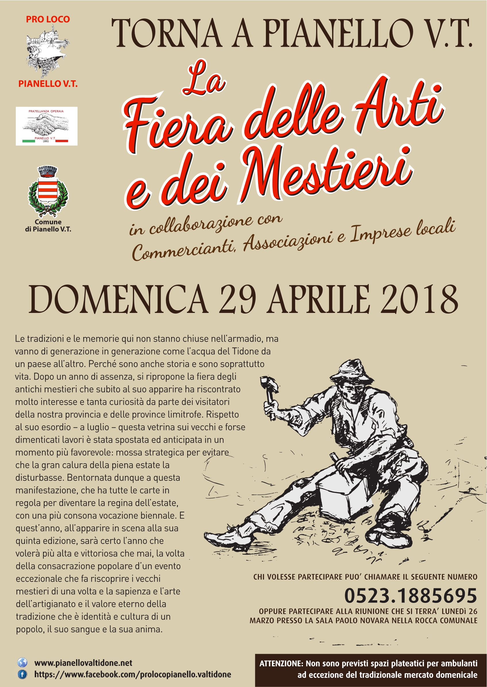 Torna a Pianello per la 5^ edizione la Fiera delle Arti e dei Mestieri... organizzata dalla Pro Loco di Pianello Val Tidone e dalla Fratellanza Operaia di Pianello Val Tidone con la collaborazione di associazioni, commercianti, imprese e attività e con il patrocinio del Comune di Pianello Val Tidone...