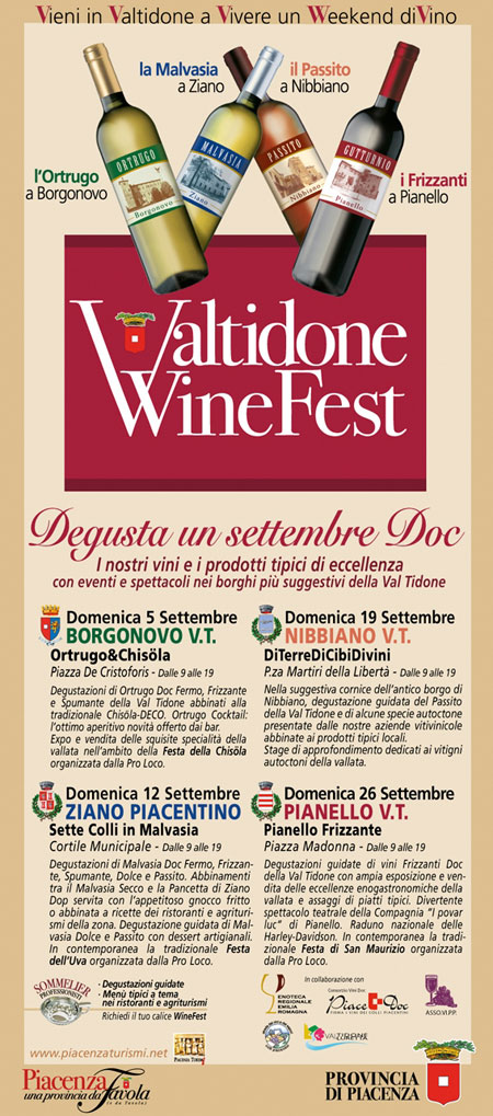 Prima edizione della rassegna interamente dedicata al patrimonio vitivinicolo della Valtidone, zona di eccellenza del Piacentino. Grande festa in onore dei numerosi vini locali che si fregiano del marchio DOC con degustazioni di prodotti tipici e tanto altro ancora...